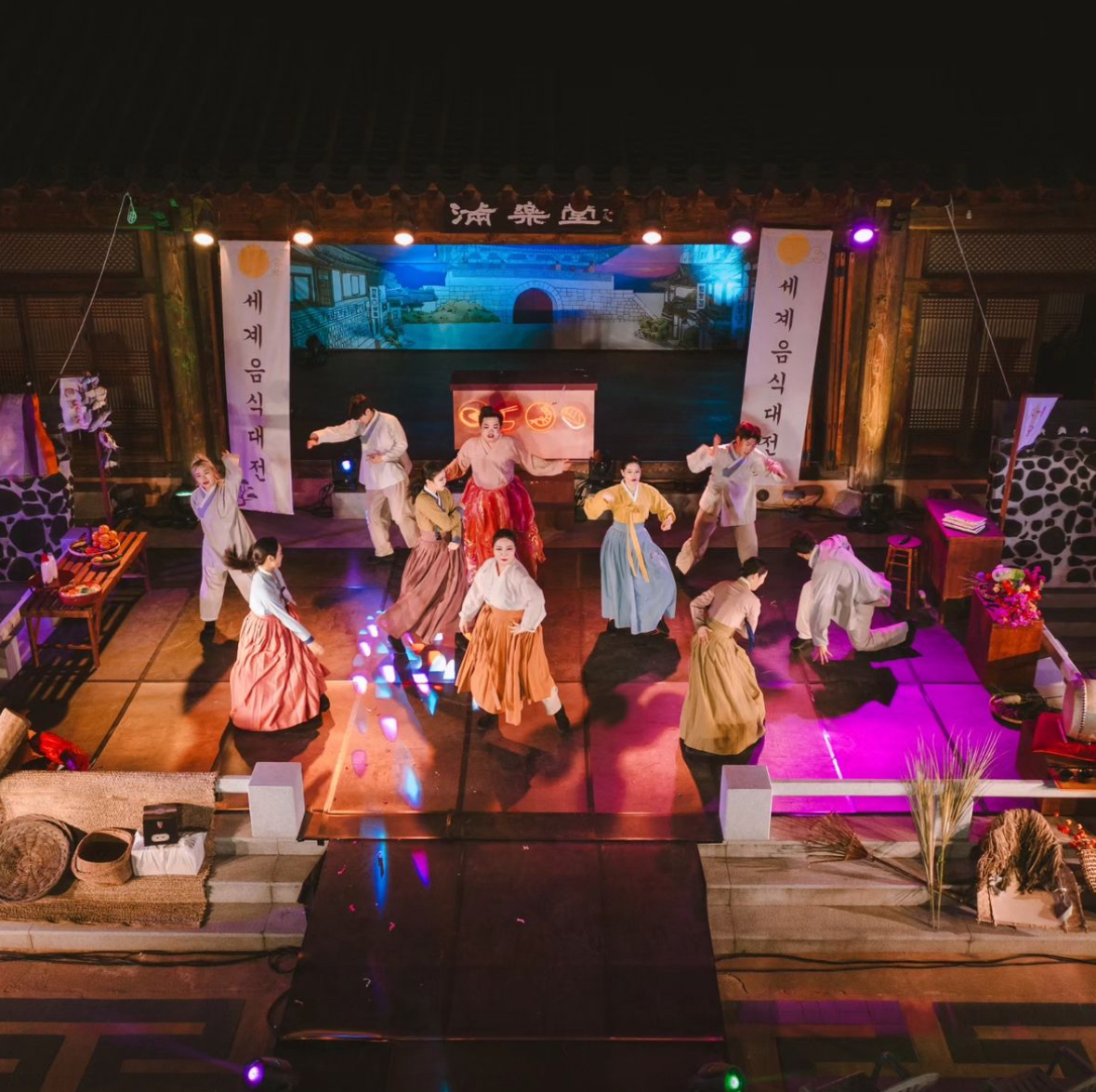 -비빔밥 패션쇼: 공연 중 비빔밥 재료를 패션쇼 형식으로 소개하여 시각적 즐거움을 더합니다. 이는 음식의 아름다움을 강조하며 관객의 흥미를 유도합니다.